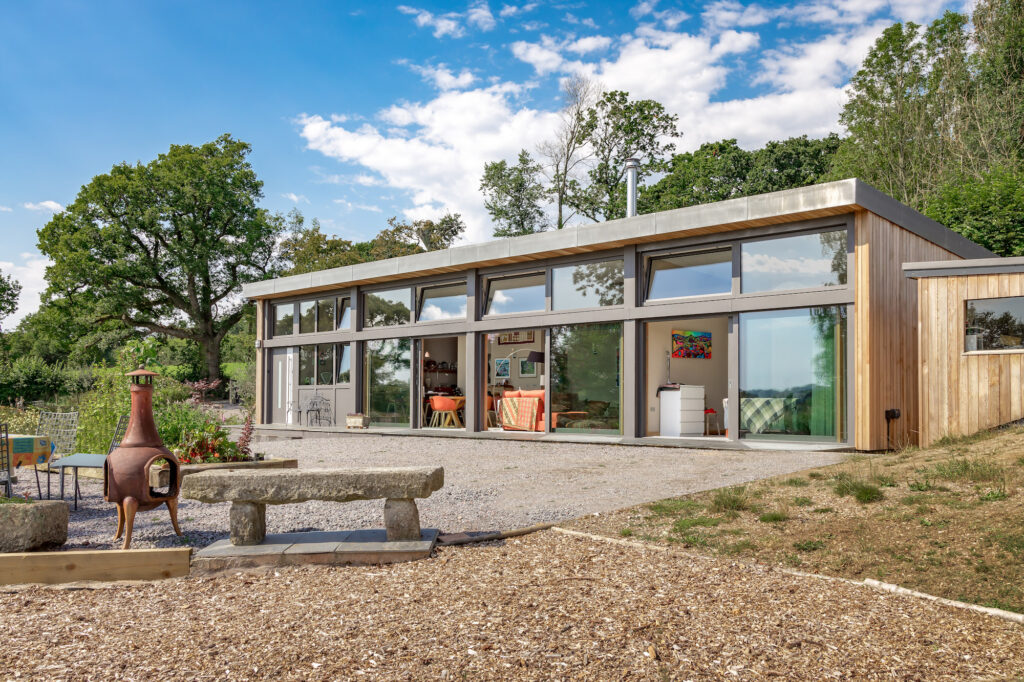 Located in Dunsford, just outside of Exeter nestled into lush greenness the smooth curved roof is the first thing you notice it sets the tone for the property and conveys that this is a place of calm; a gentle space where there is something of a free flow between the inside and outside.