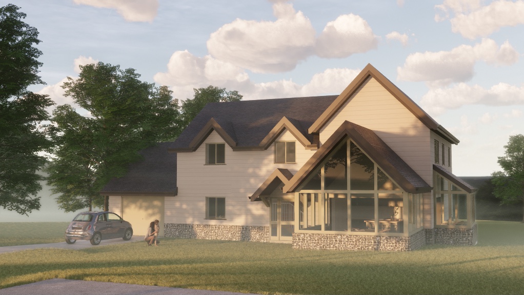 The design of the proposed dwelling is a two-storey farmhouse with local flint stone details and a timber oak frame kitchen and sunroom.