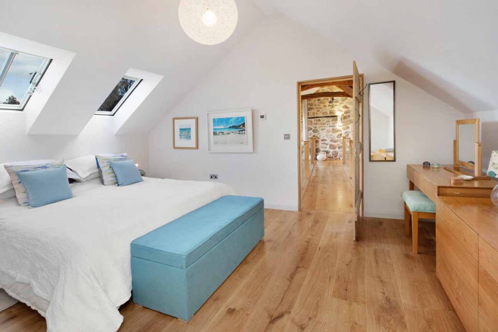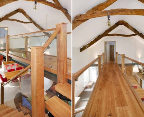 At first floor level, the converted barn has three bedrooms and a suspended walkway that connects the rooms and leads to the staircase.