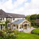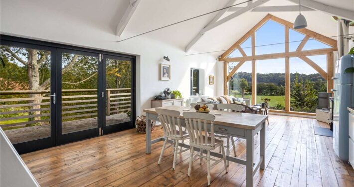 The heart of this home is its vaulted, open-plan kitchen, living, and dining area. This expansive space, adorned with oak beams and bathed in natural light, creates an airy and inviting atmosphere. The vaulted window, a striking feature, frames breathtaking views across the enchanting local woods, allowing nature to seamlessly blend into the living space.