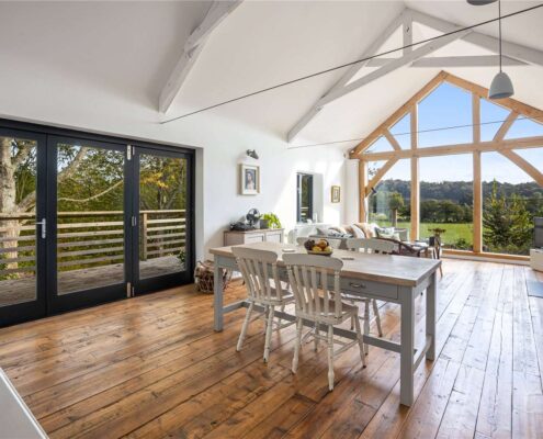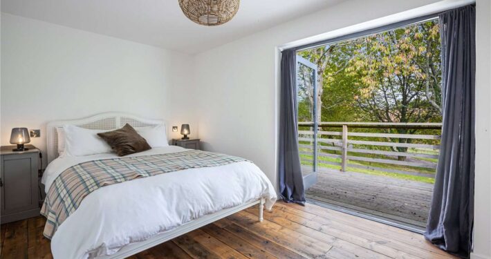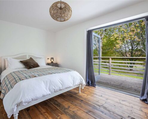 One of the bedrooms, located in the Hayloft, offers a cozy retreat with far-reaching views that stretch beyond the horizon. The use of oak frames and other natural materials not only adds to the aesthetic appeal but also ensures a warm and welcoming ambiance.