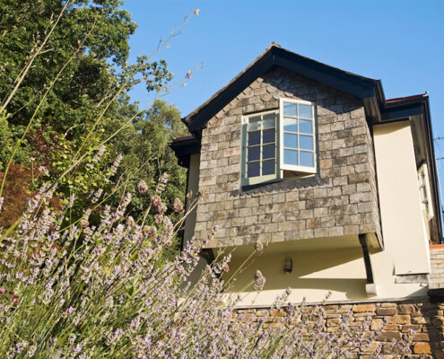 The Cottage Orné style—literally “decorated cottage”—was popularised in the early 19th century as a romantic counterpoint to classical architecture. These buildings were often retreats for the elite, designed to evoke an idealised rural life. Hallmarks include asymmetrical rooflines, ornate bargeboards, latticed windows, and whimsical detailing that blends into the landscape. At Weir Cottage, these features were not only preserved but subtly enhanced. The new wing mirrors the original proportions, materials, and decorative flourishes, while introducing improved spatial flow and light.
