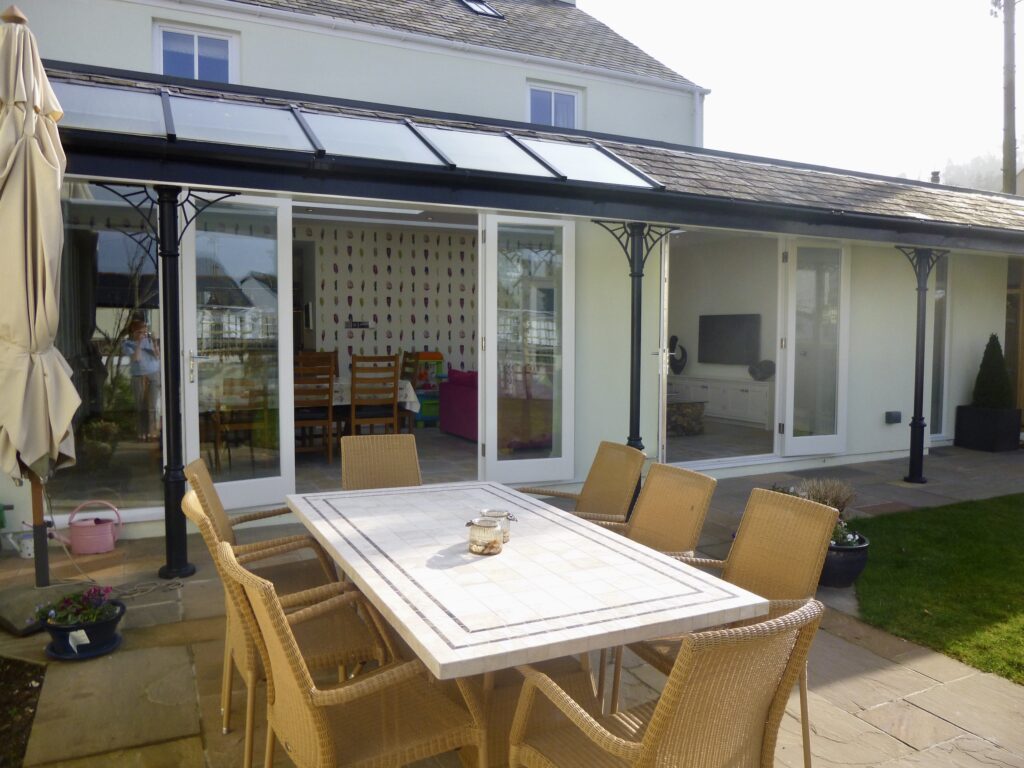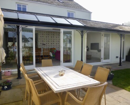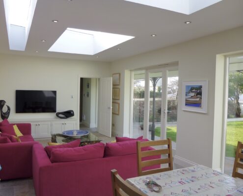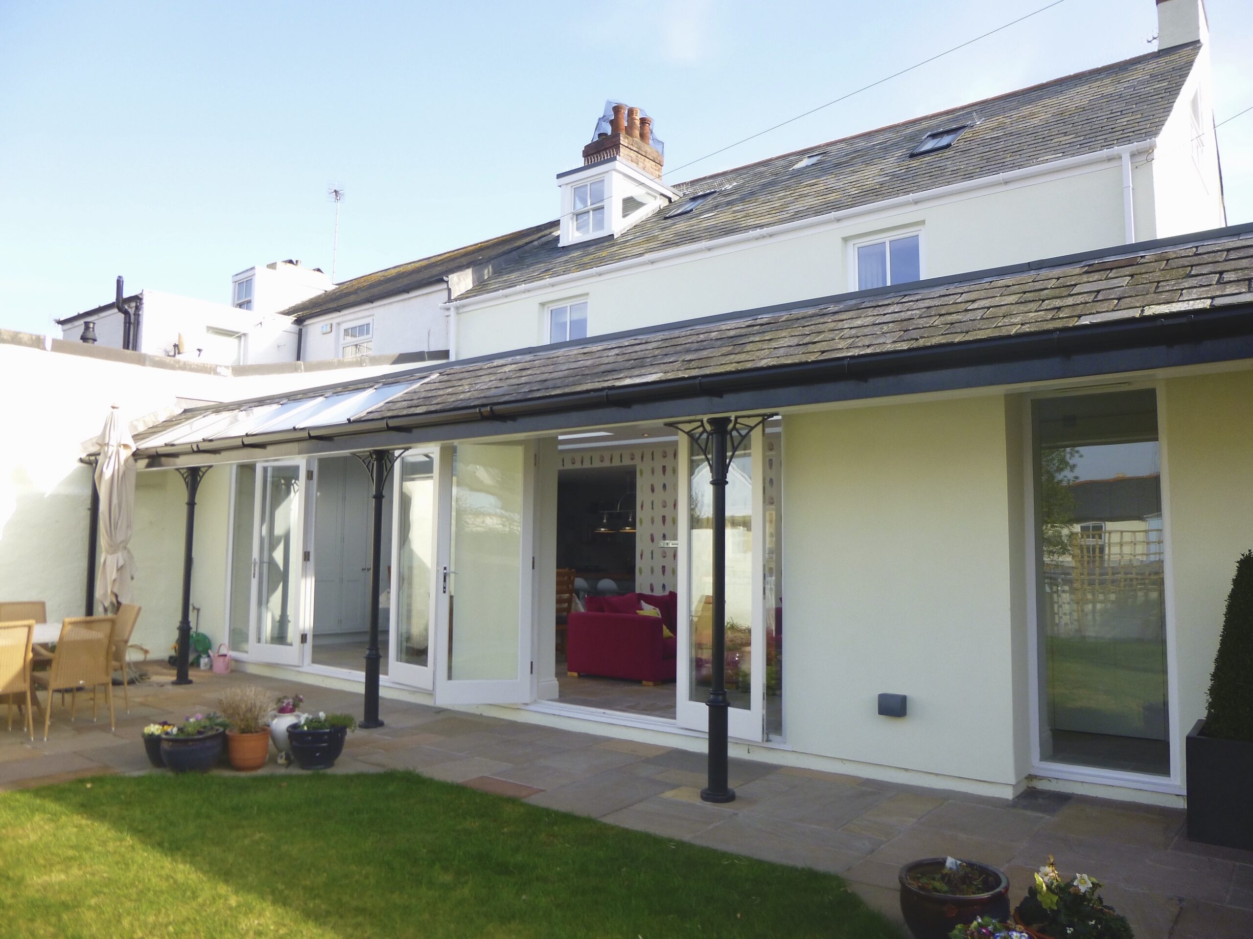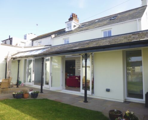 A garden room extension to a Grade II listed property on the Green in Shaldon. The extension is traditional in aesthetic to meet the client’s brief of a simple form with a veranda. The internal spaces are light and bright, and connect well to the external courtyard garden. At the end of the garden is a small swimming pool, which sits tucked away behind a local breccia stone wall, blending seamlessly into the historic back streets of Shaldon. The property was refurbished throughout with Living Space gaining planning and listed building consent for the works and then completing Building Regulations drawings.
