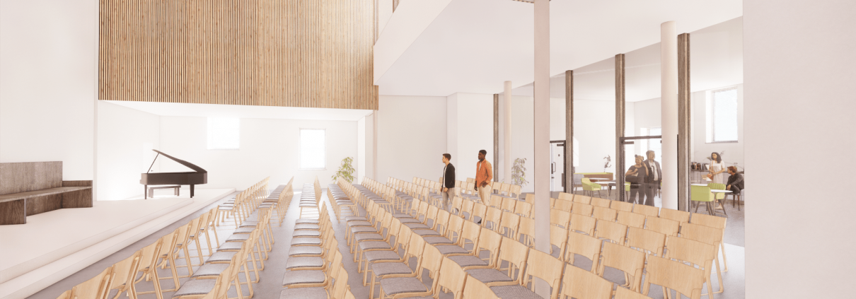 We knew from the outset that the interior spaces required a high-quality design strategy, and we intended each space to bring something new and different to the renovation of this building. This raised a range of considerations, from the function of each space down to the quality of finishes used. The style of design had to be sympathetic to the building’s past, but also needed to enhance and be conducive to modern life. The renovation is partly intended to act as a means of attracting people to use the building, and better appreciate all it has to offer. Opening up the interior spaces allows the building to be versatile, in keeping with its use as a site of varied activities. Below are some of our initial 3D views of the new interior spaces: